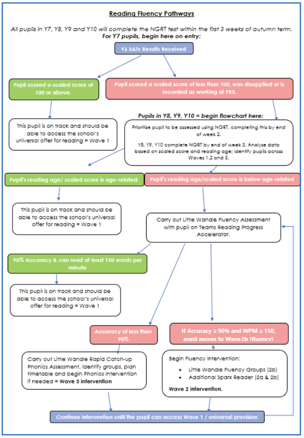 At St Aidans, we follow the NLLT Reading Pathway flowchart and Waves to assess and provide universal or targeted support for pupils.